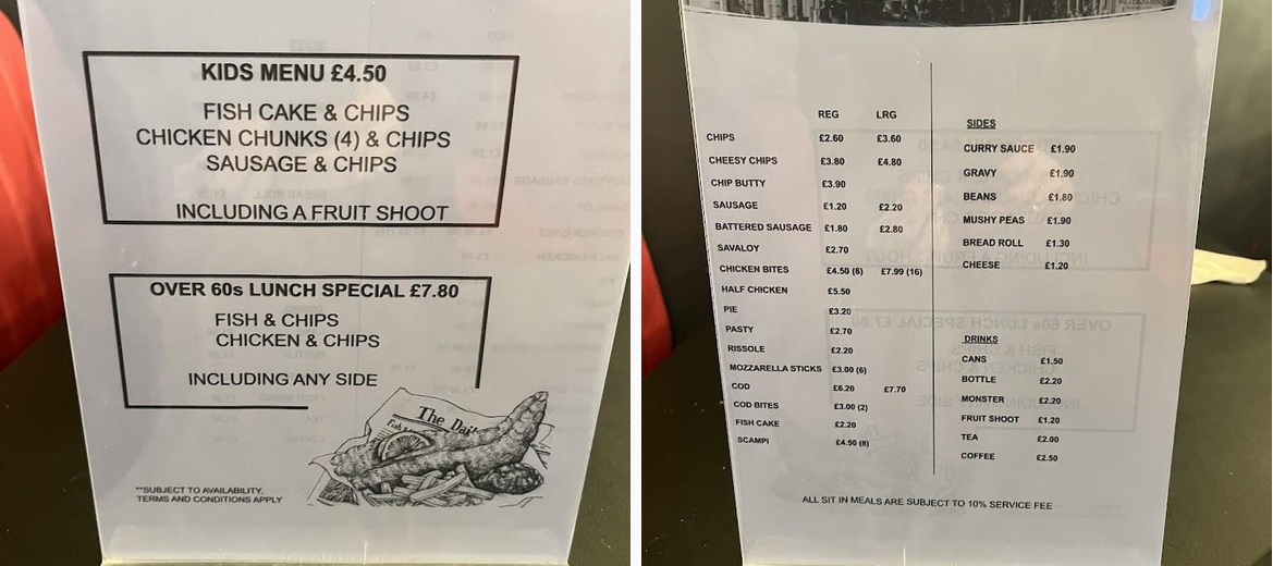 Best fish and chips i've had in years! The batter was golden and crispy on the fish and the chips were a really good portion size. friendly staff who were singing behind the till. Just an all round great experience from my new favourite chippy